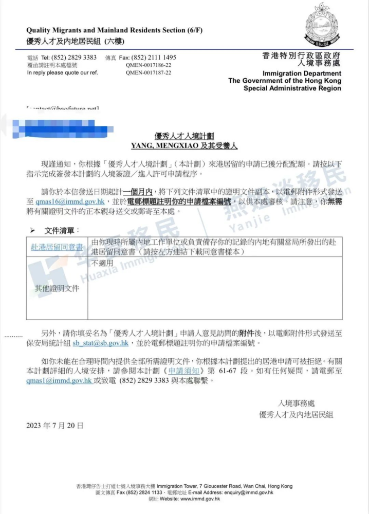 Y女士的香港优才批复函