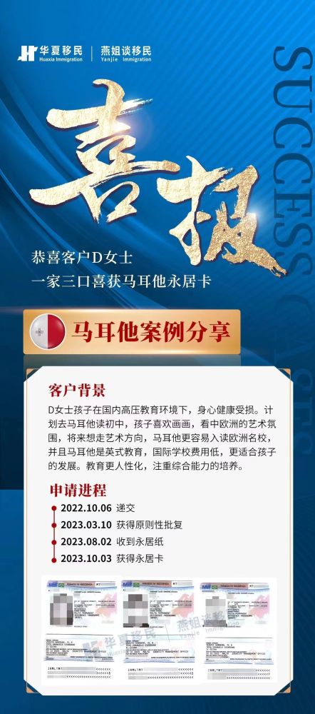 由于W女士是自由职业者,虽然资产足以申请马耳他永居,但收入不稳定,因此解释资金来源有一定的困难,中途被要求补件。华夏移民文案再次为W女士理顺资金方案,支撑50万欧元的资金证明。最终顺利获批。