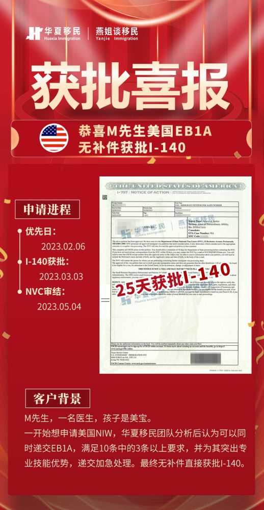 M先生是副主任医师,博士学位。一开始想申请NIW,但经过华夏移民团队分析后认为可以同时递交EB1A的申请。M先生满足EB1A申请10条中的3条以上要求,不过难点是他一直深耕同一个领域,虽然学术论文非常突出,但其余方面就相对较为弱势了。因此,华夏移民的文案团队大量挖掘其背景材料,突出其它各方面的专业技能优势,并递交了加急处理。最终无补件直接获批,且快速收到NVC缴费通知,递交NVC。