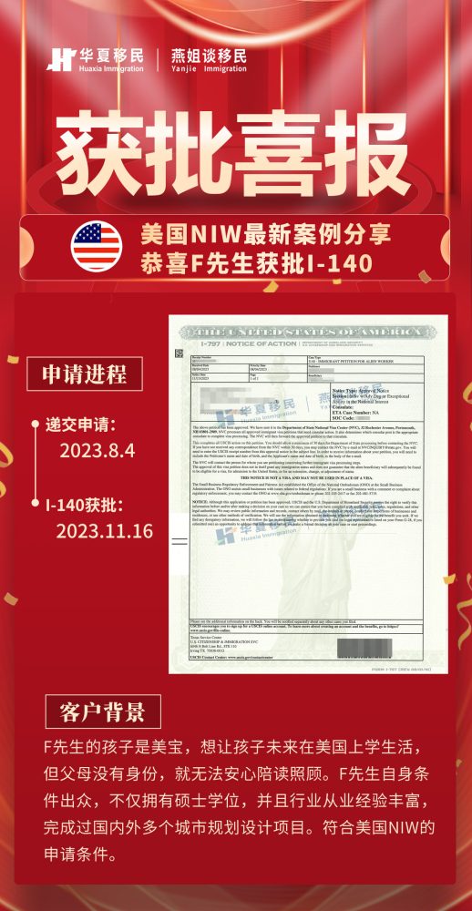 美国NIW的核心是为美国带去利益,F先生的学历和专业技能都很出色,但当中从事过其它工作。因此华夏移民团队帮助F先生有效地组织证明材料,完善赴美计划书、突出他对行业做出的积极影响和贡献。最终在没有递交加急的情况下,3个月获得批复。