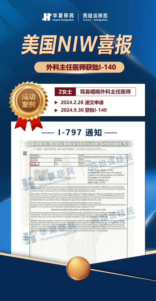 华夏移民NIW最新案例,客户Z女士获批I-140。