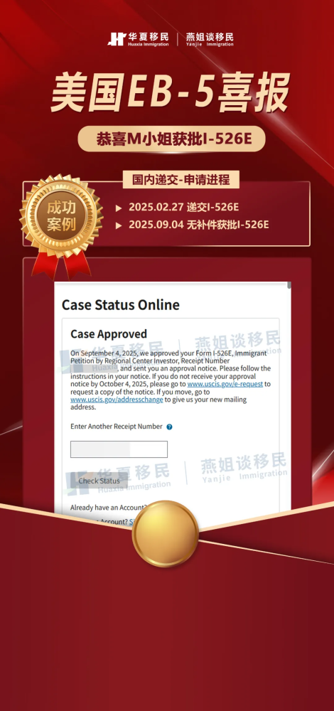 由于整体方案设计合理,材料准备详尽,M小姐的EB-5申请过程相对顺利。国内递交申请仅仅半年就获批I-526E,非常迅速。
