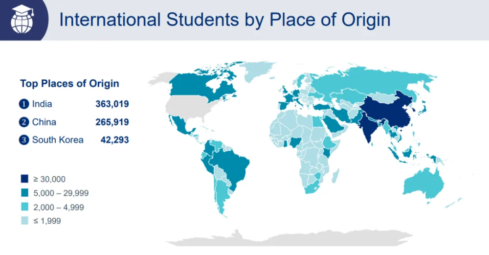 11月,美国发布了2025年度门户报告Open Doors。美国高校在 2024~25 学年接收国际学生总人数为 1,177,766 人,比前一学年增长约 5%。印度成为最大来源国,约 363,019 人,同比增长约 10%。