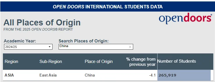 根据 Open Doors 数据显示,中国学生在2019~20学年达到高峰:约 372,532 人。但是从从 2020~21 学年开始大幅下滑,主要是受到疫情、签证政策、地缘政治等多重因素影响。