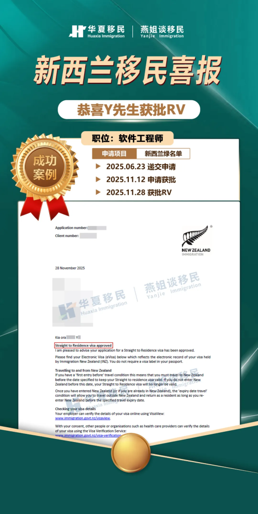 Y先生毕业当月,我们迅速为提交了绿名单移民申请,凭借他的IT专业优势及政策豁免条件,整个流程顺畅高效。从递交申请到获批RV,仅仅用了5个月。