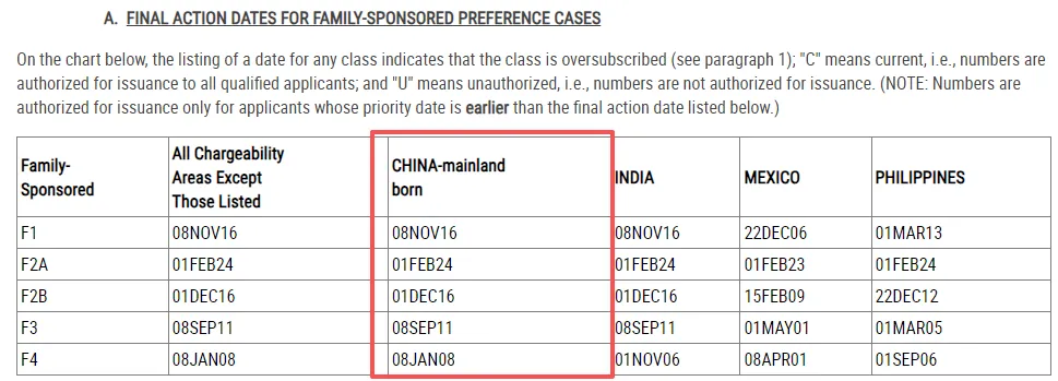 亲属移民F2A(绿卡持有人的配偶和未成年子女),2024年2月1日,无变化;