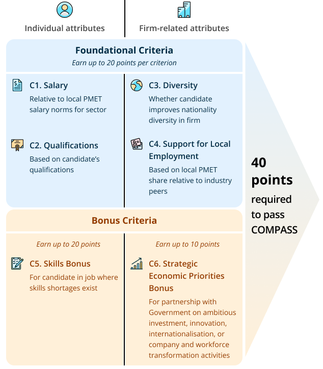 - COMPASS加分:若职位属于“紧缺职业清单”(如AI开发、半导体工程等),可在评分中获得额外20分加分,有助于加快EP审批。
